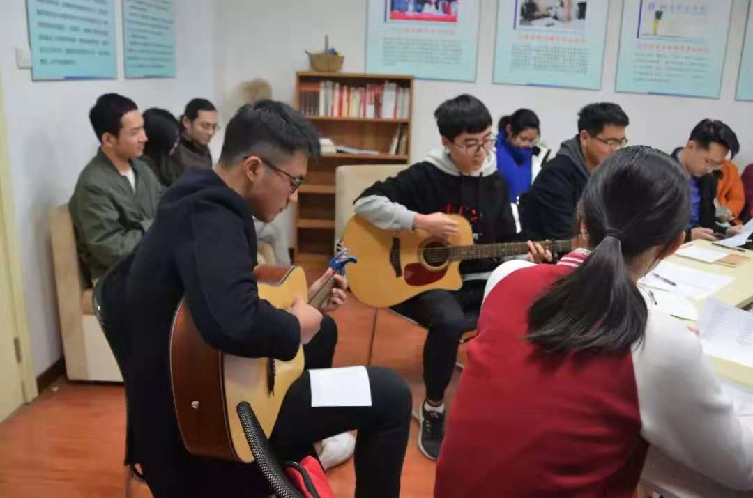 在第二个环节中,三位同学弹着吉他带领大家唱首歌曲放松,团队成员进行了“谁是卧底”的小游戏,现场气氛幽默诙谐。放松之后,本次活动第三个环节结合大学生最关注的一个问题“先考研后工作,还是先工作后考研”展开辩论。